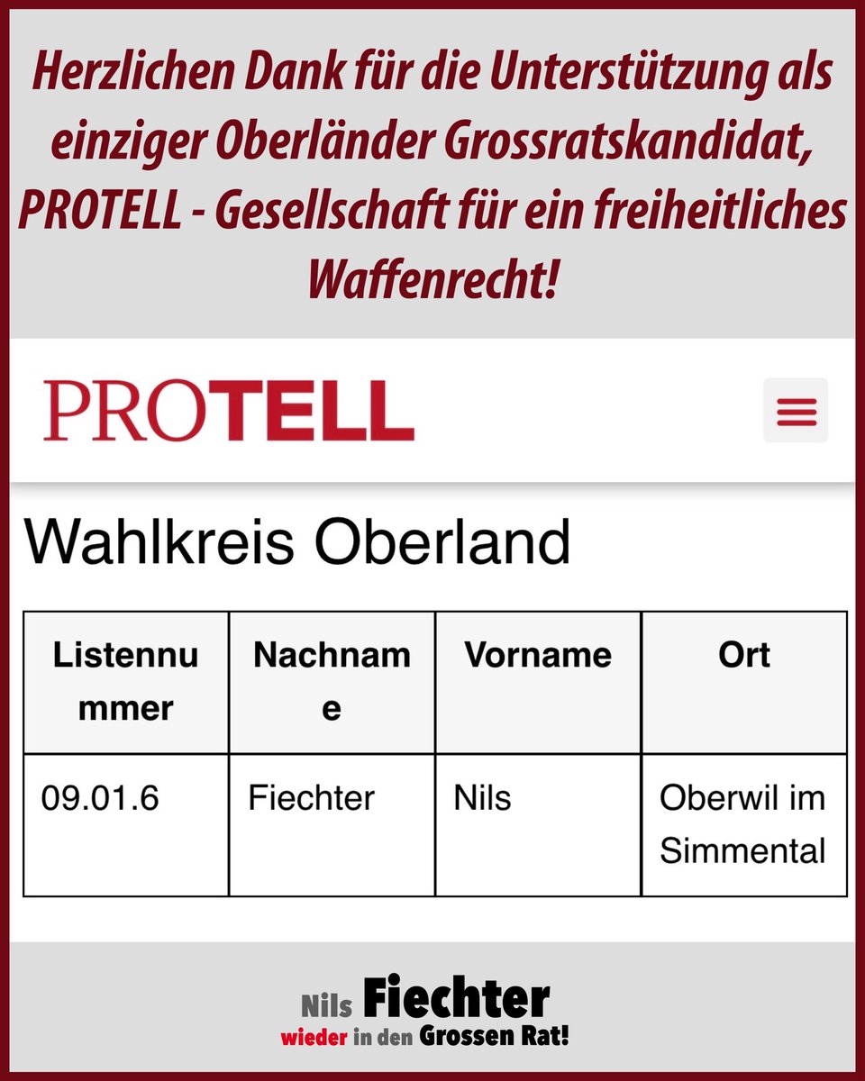 Herzlichen Dank für die Wahlempfehlung als einziger Kandidat im Berner Oberland, PROTELL, Gesellschaft für ein freiheitliches Waffenrecht [@protell.ch ]!
