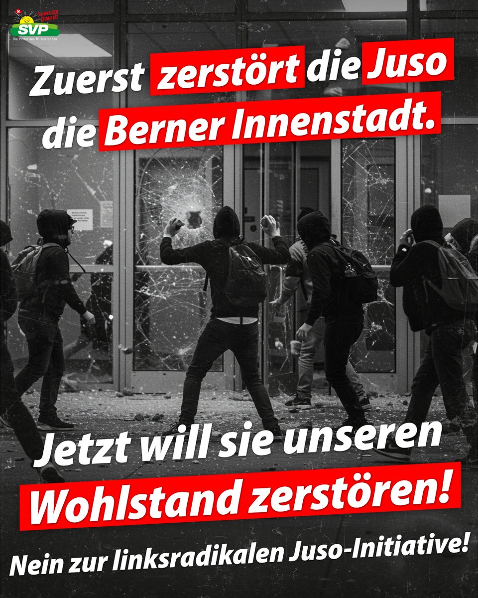 So wie die linksradikale Juso die Innenstadt von Bern zerstört, will sie mit ihrer Erbschafts-Initiative unseren Wohlstand zerstören. Darum: Nein zur linksradikalen Juso-Initiative!